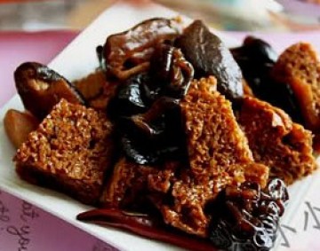 8.加入过油后的烤麸,煸炒,煮10分钟,待烤麸入味,基本汤汁收尽