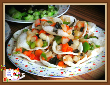 主料:炸虾片、胡萝卜、青椒、山药、番茄各一只
