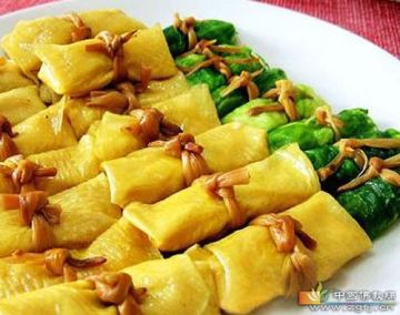 豆腐,油豆皮,水发黄花,青椒,胡萝卜。 调料:盐,蘑菇精,香油,胡椒粉,姜片,酱油。
