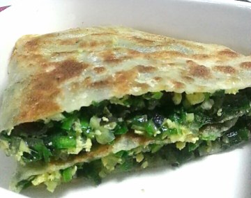 3、盒子皮要薄,在烙的过程中或在烙好的时侯透过面皮能看到绿色的馅料。因为面皮薄,所以很容易熟,烙的时间短,面皮也不干硬。