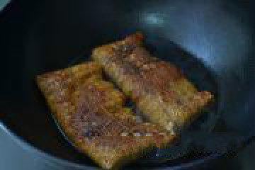 5、锅中倒油,小火煎豆皮块直至两面金黄。