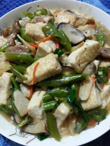第二种:素菜菜谱双菇梅肉烩豆腐做法