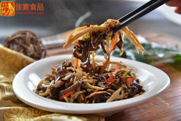产品原料: 优质木耳、茶树菇、山竹笋、杏鲍菇丝
