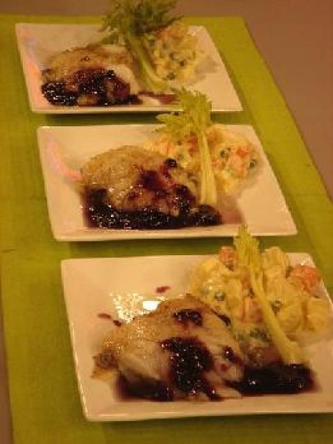 4 在鳕鱼上面淋上蓝莓酱,作为最主要的调味品,酸甜的口味及营养最适合夏季食用!