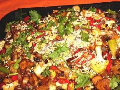 4、 锅烧热放少许油煸香花椒、干辣椒后,放入葱段、姜片、蒜瓣,出香味后,放入八角桂皮、香叶,老干妈豆豉酱(能吃辣的就多放点,反之就少放)迅速放入洋葱、笋条、藕片、菜花、海带翻炒加入少许汤汁放盐、糖、鸡精、酱油调味,最后放入芹菜、红尖椒段翻炒。