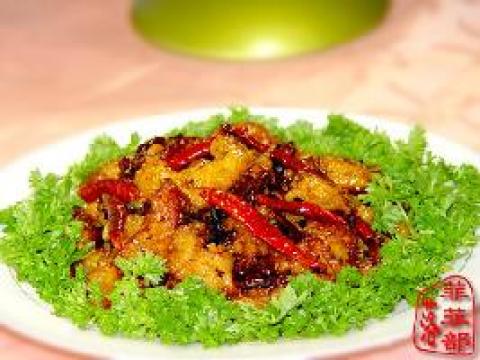 6.锅内上热油,下入干辣椒,豆豉炒香。下入鱼片,随即下入调味汁翻炒勾芡即可。