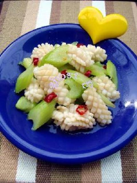 3.热油锅,倒入西芹和目鱼卷,加一勺辣椒油、加盐、鸡精调味后即可出锅。