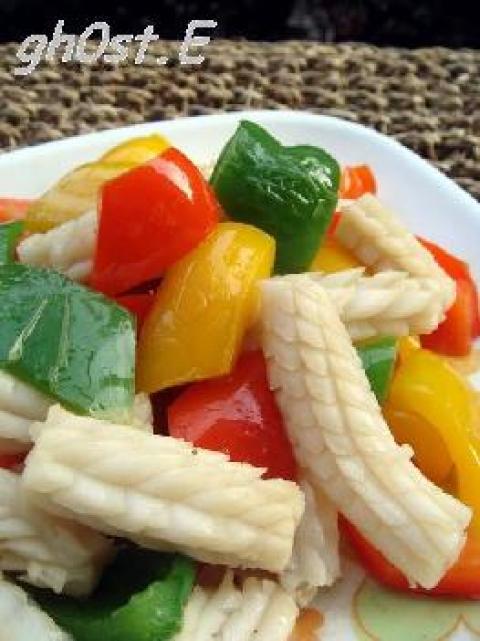 3.油锅煸炒彩椒,加盐、鸡精、蒜蓉酱调味,最后倒入目鱼,加少许料酒稍翻炒即可。