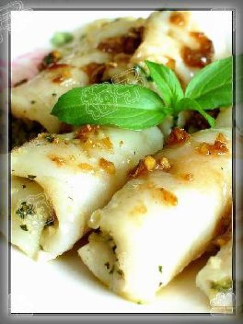 4.另起油锅爆香蒜蓉.用蚝油和水加生粉煮开勾一个芡汁浇在上面.