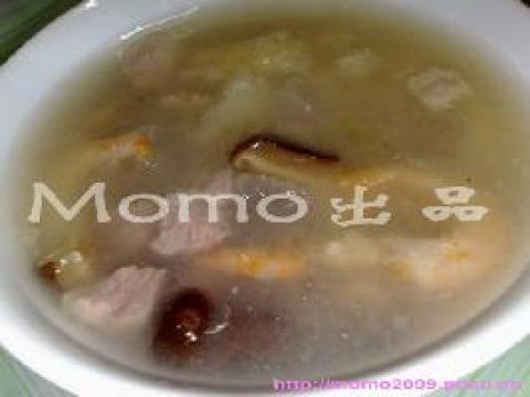 6.水烧开后加入姜片,然后加入鱼肚、虾米、香菇、冬瓜及猪肉粒煮15分钟。