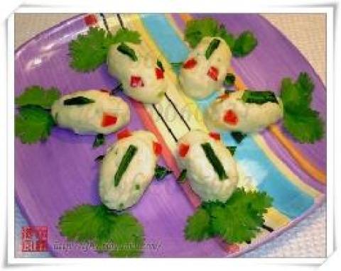 3.待稍晾凉后做成一个个小椭圆球,摆在盘子里。然后用的香菜叶做鱼尾巴,黄瓜皮做鱼背鳍和胸鳍(用小刀修出外形)。金鱼眼就用红甜椒的边角料切成小丁来做就行。