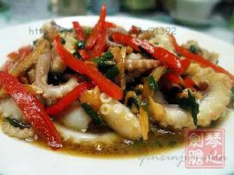 2.把姜、葱、蒜、红椒切好入油锅加生抽拌熟,起锅加上醋淋拌在焯熟的章鱼上就好了。