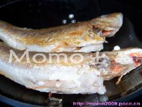 2.热锅下油,放红衫鱼,中火煎至两面金黄熟透