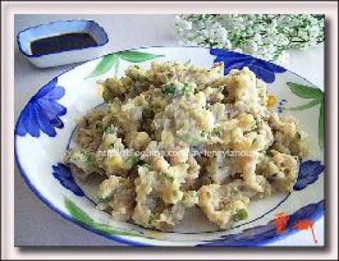 3.用少量番薯粉拌和腌制好的鱼肉(一般一条鱼肉我用2匙番薯粉),一定要番薯粉,不能用其他生粉代替,不然就永远做不出来韧嫩的口感.腌制鱼肉是关键,那么这个用番薯粉就是关键中的关键了.成败在此一举!