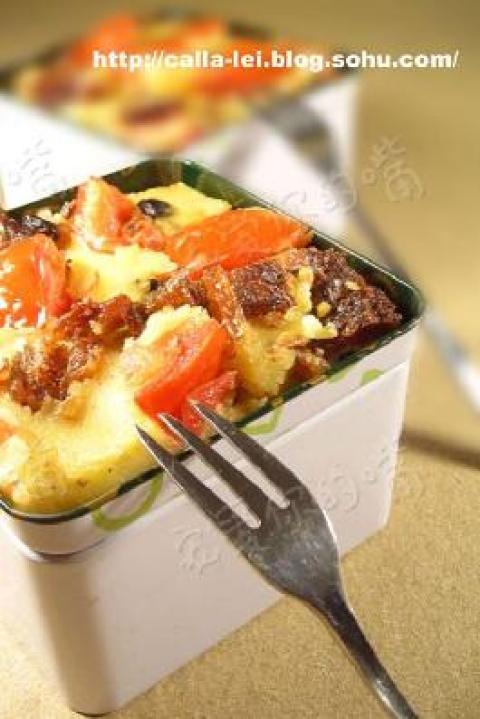 4.把番茄丁、鲮鱼肉丁撒在面糊上。罐头中的豆豉也可以撒一些。