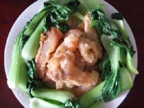 因为喜欢酸甜的口味,所以用剩下的生粉、白糖、醋和少许水调了个糖醋汁淋在脆鱼片上,并配上炒好的青菜。