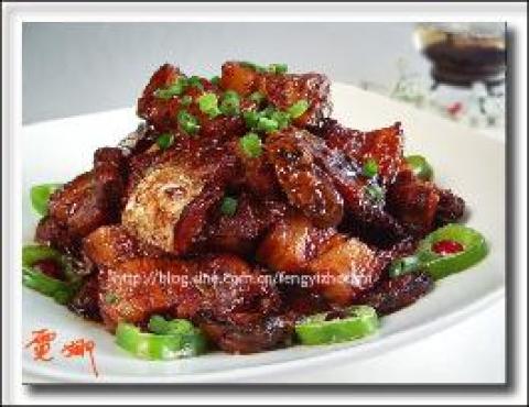5.油锅烧热2匙素油,把葱姜蒜推入爆香,先入五花肉翻炒,把肉中的肥油逼一些到锅里(大概2分钟),烹入料酒2大匙,放冰片糖(没有的话白糖冰糖一大匙也可以)大半片,老抽1匙,开水加到盖过肉表面,加盖烧滚后,把鱼干和淡菜干放入.