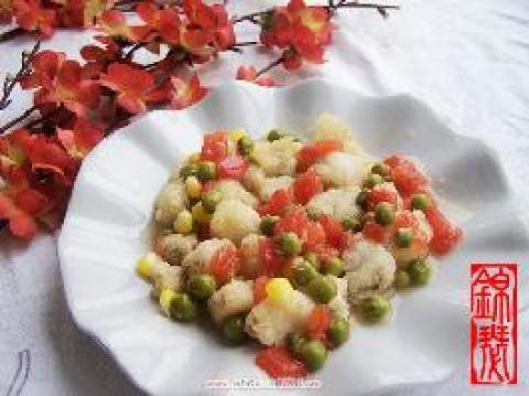 3.先制作浇汁,用少量水先煮柠檬皮蓉3-5分钟,加白糖、柠檬汁、玉米、青豆、西红柿,勾薄薄的一点芡。