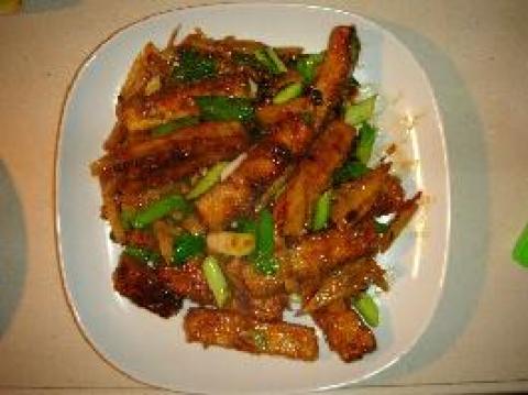2.坐锅,放少许油,下入豆豉,大料,葱,姜,蒜,盐,糖,酱油,醋,炒香,加入少许清水,再放入炸好的豆腐煨3分钟,淋淀粉,撒青蒜,出锅!