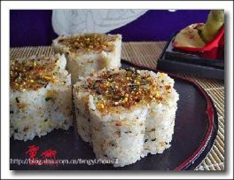 2.加入柴鱼紫菜,用模子压严实,再撒上些柴鱼加强口味就好啦.