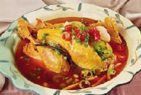 2.锅中放入红油,烧至七成热时,放入干辣椒,煸炒至干辣椒变成淡黑色,加入清水,放入黄姜粉,大火烧开,小火熬15分钟至出香,过滤去渣,将洗好的仔鸡放入熬好的汤中烧开,用小火焖30分钟,放入茶树菇、鲜山药小火煮5分钟,用浦源鱼酿酱油、胡椒粉调味,出锅装入盘中,用青、红椒圈和葱花点缀即可。