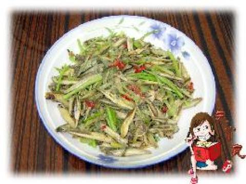 4.加入小鱼儿翻炒,最后放入芹菜,炒几下,加适量鸡精、盐(小鱼儿是咸滴,加一点就ok了哦!)出锅!