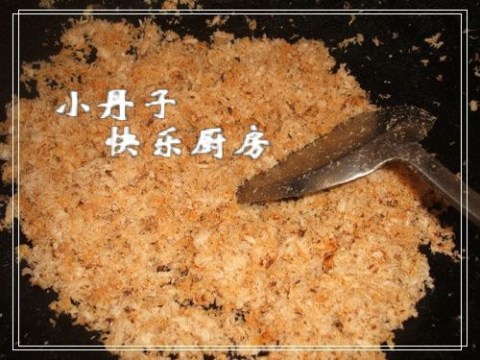 2.把鱼肉放入干净的锅中不停翻炒,边炒边用锅铲把鱼肉捅散,注意须用小火,不然很易烧焦或是出现锅巴,炒至快干时沿锅边加点油,不用加太多,我加了二汤匙。