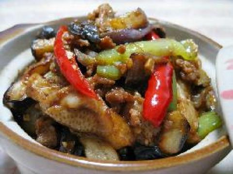 5.肉馅炒熟后放入炸好的茄子,青椒,木耳,烹入佐料2,大火翻炒并收汁入味后出锅