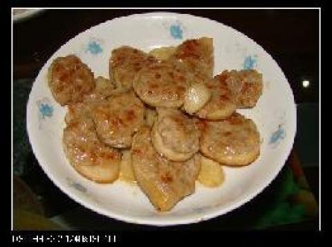 3.将肉馅抹在鲍鱼菇一面 稍压一下(事实上肉馅很粘的) 逐个做好 平锅倒油 将做好的鲍鱼菇放在平锅里 肉馅面朝下 盖上锅盖小火煎6-7分钟 翻个 在稍煎一下 添点水 将切成片的马蹄加入 稍加点盐 鸡精 最后勾点淀粉出锅