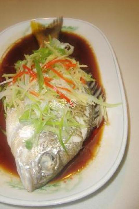 4.鱼熟了之后洒上葱丝,姜丝和辣椒丝,锅里烧开少许花生油,倒在上面,会吱吱响,就可以上桌了,不用加味精。