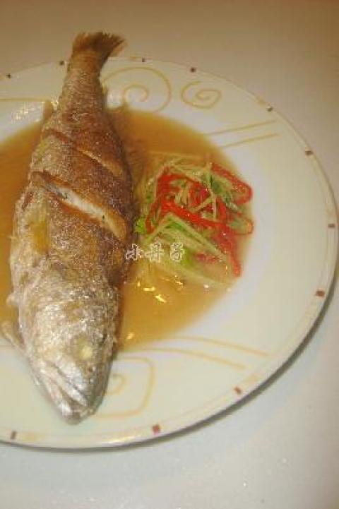 2.把鱼身擦干水份,热锅下油,把鱼两面煎成金黄色后加适量水,把葱姜丝和辣椒丝放进去,盖上锅盖煮熟后加盐和味精调味即可.