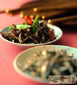 (2)将锅子预热,加入适量的油,再放入小鱼干,用中火拌炒至外表略呈金黄色,再加入调味料翻炒均匀后,起锅前再撒入豌豆荚、辣椒片略炒数下,使豌豆荚变绿即可盛起食用。