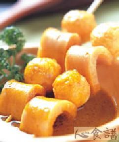 鱼蛋8粒,鱼片8片,竹签4只,酱汁材料:1小匙,牛油10公克,咖哩粉1大匙,高汤600公克,椰浆1大匙,奶油1小匙,盐少许