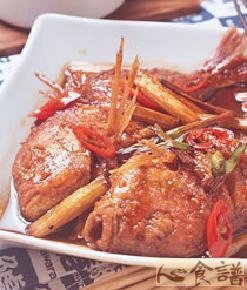4.另热一锅放入适量的油,将姜丝入锅爆香后,加入作法2的鱼与作法3的葱段、酱油、糖、香菇精粉、水一同烧煮至完全入味。