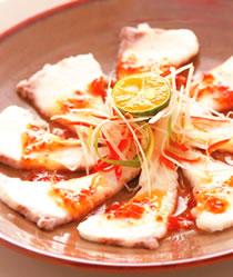 1.海鲡鱼切片后,放入滚水中汆烫熟后取出,泡于冰水中约2∼3分钟捞起、摆盘备用。