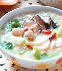 汤底:125㏄,米1/2量杯,煮物:50公克,山药30公克,鲜香菇1朵,干贝5颗,枸杞20公克,鸡蛋1个