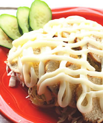 3.把作法1的鱼卵切成厚约0.4公分的薄片,铺于作法2的高丽菜丝上,最后挤上沙拉酱即可。