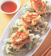 1.竹荚鱼去骨去刺后,用刀子剖开后依序沾裹上太白粉和面衣;山苏洗净后再沾裹上一层薄面衣备用。