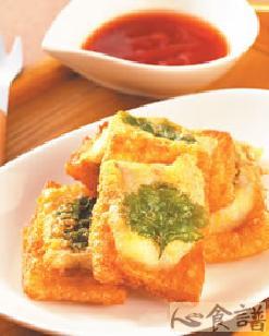 5.将炸油烧热约120℃,朝下放入作法4的吐司鱼片,以中小火油炸约30秒,再转中火炸至金黄色,即可捞起沥干,上桌时沾蕃茄酱食用。