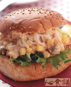 罐头鲔鱼50公克,洋葱末20公克,玉米粒10公克,生菜叶1片,汉堡面包1个,美乃滋1大匙,糖1/4茶匙,黑胡椒粉1/4茶匙