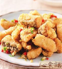 2.将作法1沾好粉的肚档块,放入150℃油锅中炸约3分钟至熟透,备用。