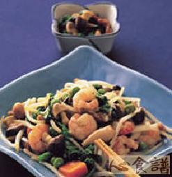 (3)起油锅爆香蒜末,再依序放入虾仁、青豆仁、红萝卜丁、油菜花菇蕈泡菜及调味料拌炒片刻,最后加入豆芽菜炒熟,至所有材料全熟入味后即可盛盘。