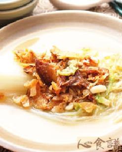 1.将猪皮泡软,挤干水份;大白菜洗净切段,汆烫备用。