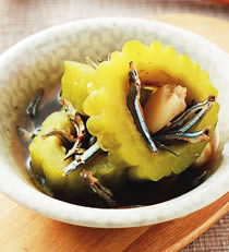 苦瓜500公克,小鱼干20公克,蒜仁5颗,细砂糖1小匙,酱油2大匙,料理酒1大匙,水50㏄