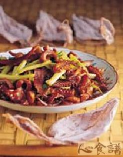 (2)先将鱿鱼浸泡在水中约2小时,取出洗净切成条宽0.5公分段。