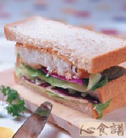 3.将吐司抹上美乃滋,夹入作法2的鱼排、紫高丽丝、酸黄瓜片、起司、莴苣,轻压后切块即可食用。