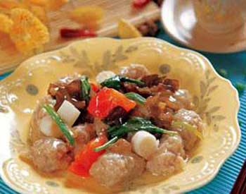 9.用湿淀粉15克(淀粉8克加水7克)调稀勾成流芡汁,倒入玉翠鱼丸裹上汁;
