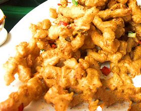 2.将作法1沾好粉的肚档块,放入150℃油锅中炸约3分钟至熟透,备用。