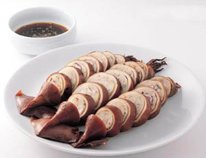 (4)把准备好的馅放在鱿鱼里,并用签子穿好,放在蒸锅里蒸出来冷凉后,切成1cm厚的圆形,蘸佐料酱。