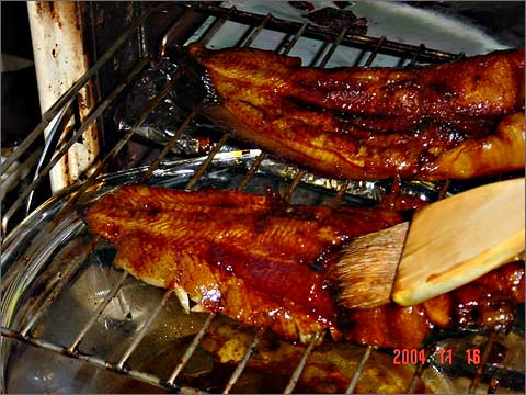 主料:大塘虱鱼1条(买时吩咐两边起肉,骨和头可用豉汁蒸来吃),豉油鸡汁(味道挺像烤鳗汁),烧烤汁